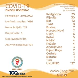 U Crnoj Gori je registrovano 127 novih slučajena koronavirusa u posljednja 24 sata. Od jučerašnjeg presjeka nije bilo smrtnih ishoda povezanih sa koronom, saopšteno je iz Instituta za javno zdravlje IJZ.