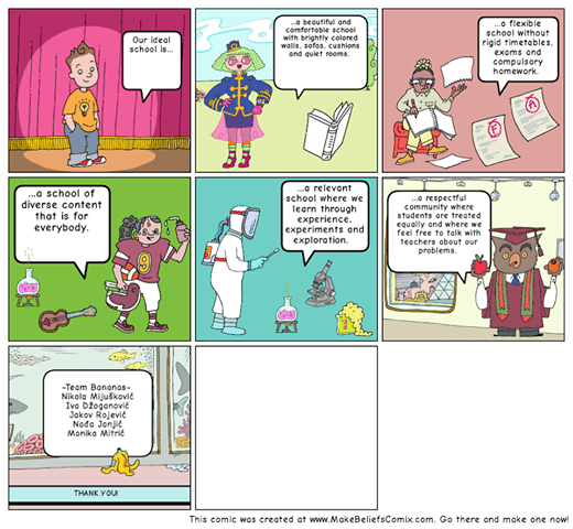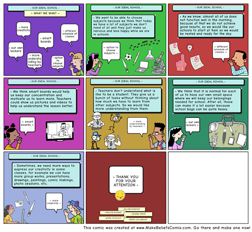 “Kada smo govorili o prednostima i nedostacima online obrazovanja u odnosu na redovno, tradicionalno obrazovanje učenici su imali zadatak da u grupama kroz stripove prikažu svoju idealnu školu. I ovaj put njihova kreativnost je došla do izražaja koristeći digitalne alate za izradu stripova. Njihove ideje su se odnosile na školu u kojoj sami mogu da biraju predmete koje žele da uče, gdje mogu da stiči više praktičnih znanja, gdje imaju više slobode da izraze svoje mišljenje, razvijaju kritičko mišljenje i kreativnost”, kazali si iz Access Program tima.