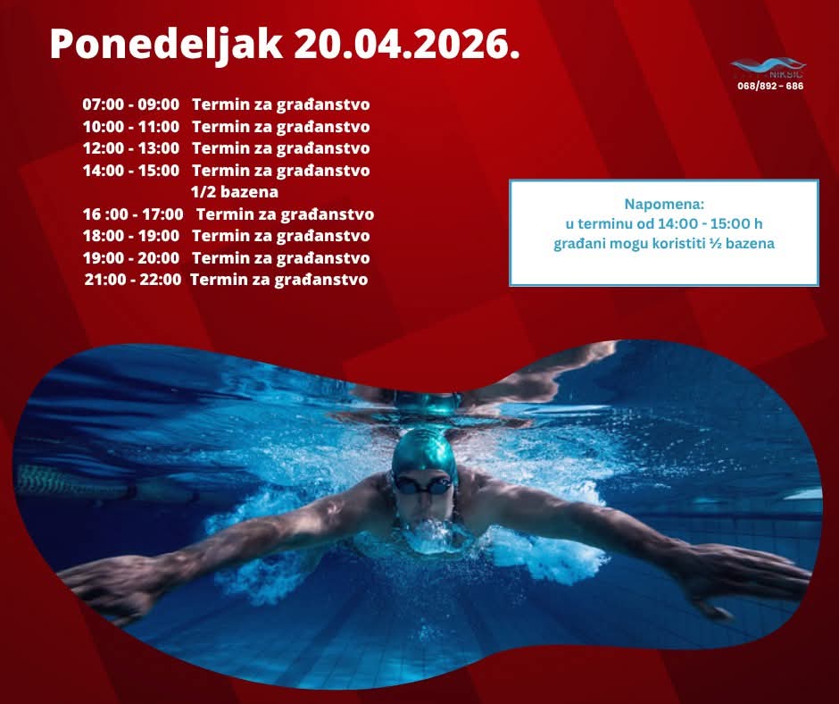 Bazen u Nikšiću objavio je raspored termina za građanstvo za ponedjeljak, 20. april 2026. godine, a svim zainteresovanim građanima biće omogućeno korišćenje bazena u više termina tokom dana.
