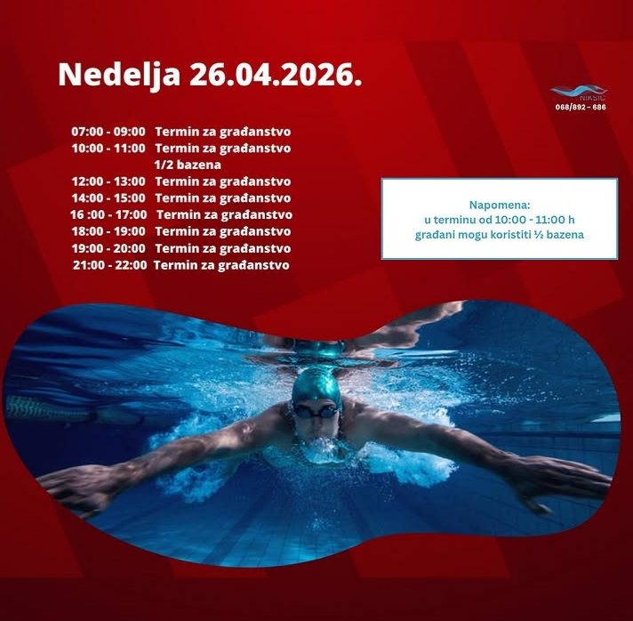Bazen u Nikšiću objavio je raspored termina za građanstvo za nedjelju, 26. april 2026. godine, a svim zainteresovanim građanima biće omogućeno korišćenje bazena u više termina tokom dana.
