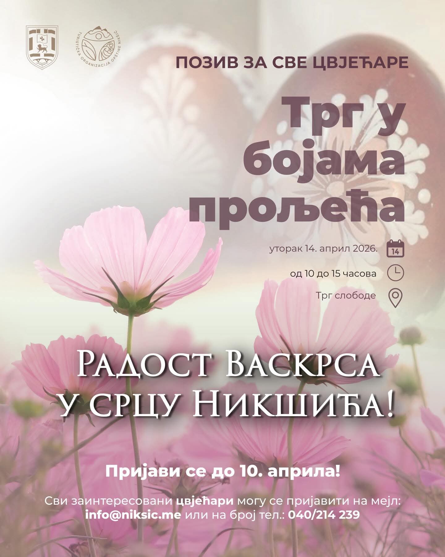 Turistička organizacija Nikšić uputila je poziv svim zainteresovanim cvjećarima da učestvuju u manifestaciji “Trg u bojama proljeća”, koja će biti održana 14. aprila 2026. godine na Trgu slobode.