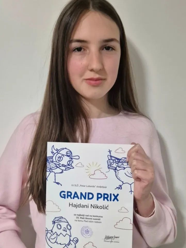 Veliki uspjeh ostvarila je učenica IX razreda Osnovne škole “Olga Golović”, Hajdana Nikolić, kojoj je uručena prestižna nagrada Grand Prix za najbolji rad na likovnom konkursu “Mali likovni susreti”.