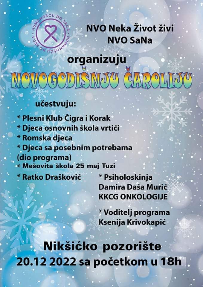 NVO Neka život živi i NVO Sana večeras organizuju humanitarni novogodišnji program, sa početkom u 18 h, i na kome učešće imaju i korisnici Dnevnog centra sa licima ometenim u razvoju. Prihod od donacije namijenjen je djeci oboljeloj od karcinoma.