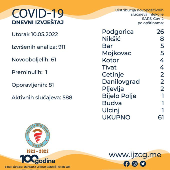 Od početka epidemijskih dešavanja (mart 2020. godine) ukupan broj registrovanih slučajeva infekcije novim korona virusom u Crnoj Gori je 100.075.