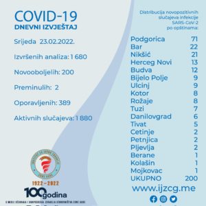 IJZ: Dvije osobe preminule, 200 novih slučajeva 24/02/2022 U Crnoj Gori je u protekla 24 časa registrovano 200 novih slučajeva koronavirusa a preminule su dvije osobe.