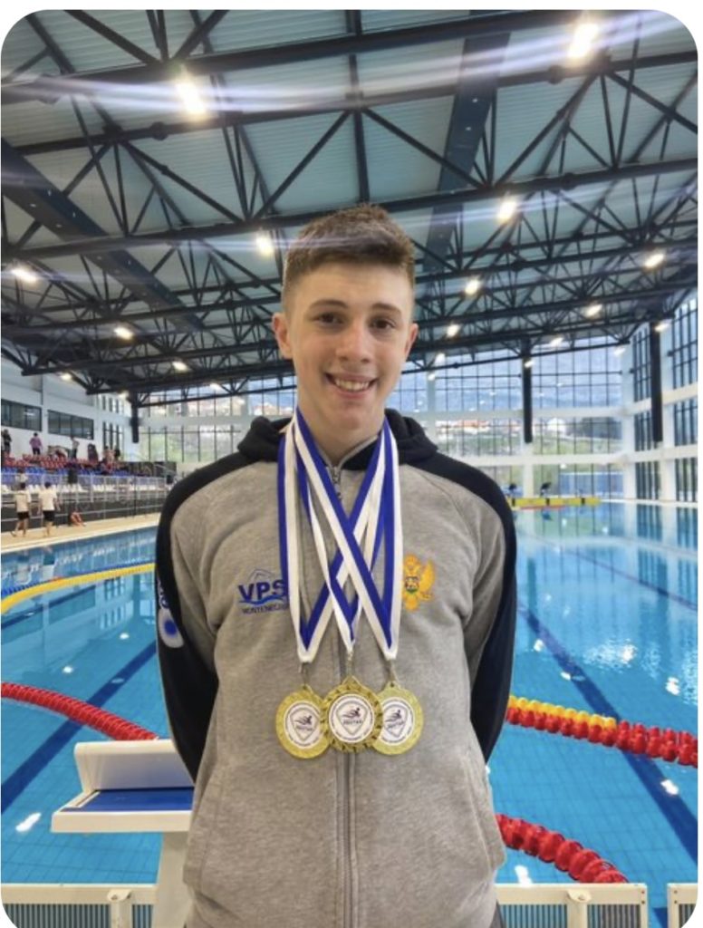 100m delfin. Dado je clan crnogorske plivacke reprezentacije i drzi vise nacionalnih rekorda u kategoriji juniora.