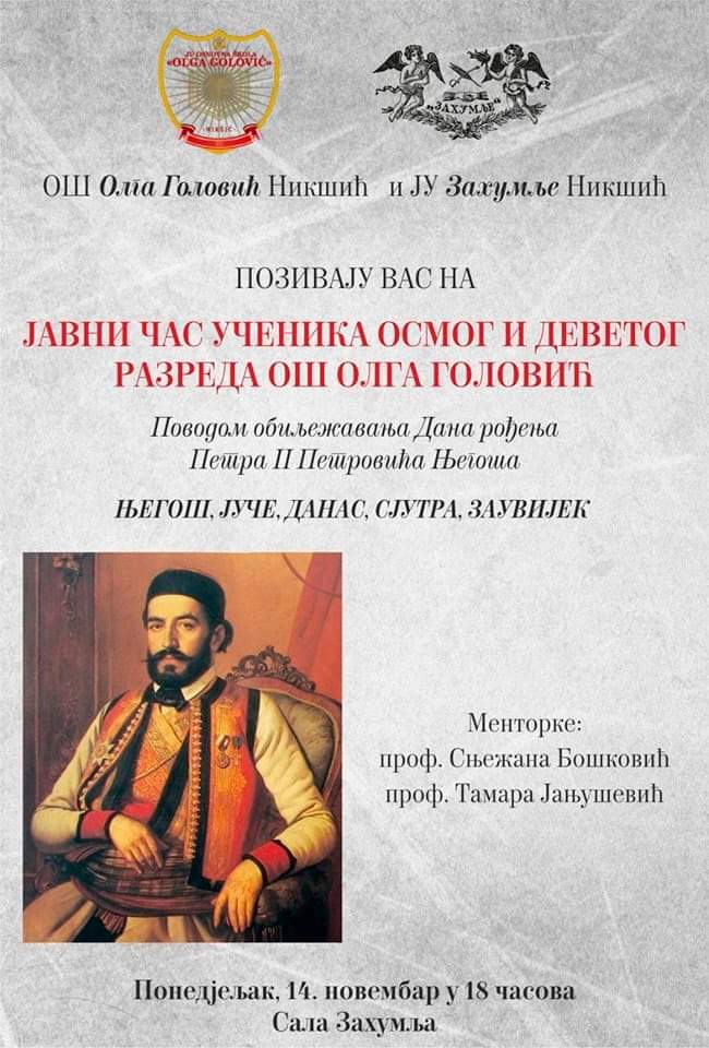 Povodom obilježavanja Dana rođenja Petra II Petrovića Njegoša, osnovna škola “Olga Golović” poziva na javni čas na temu: “Njegoš, juče, danas, sjutra, zauvijek”.Čas će održati učenici osmog i devetog razreda ove škole, čiji su mentori Snežana Bošković i Tamara Janjišević.Čas će se održati u sali Zahumlja u 18 h.