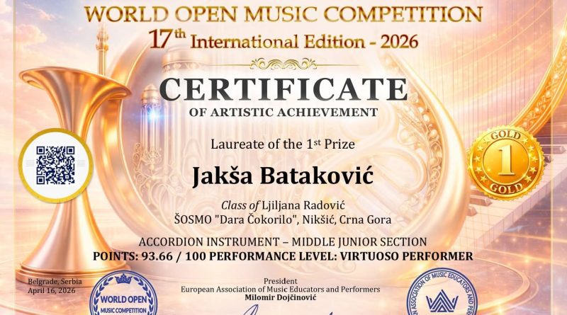 Muzička škola “Dara Čokorilo” ostvarila je izuzetan uspjeh na prestižnom WORLD OPEN ONLINE MUSIC COMPETITION, gdje su učenici ove škole osvojili prve nagrade u kategoriji harmonike. Ovaj rezultat još jednom potvrđuje kvalitet rada i talenat mladih muzičara iz Crne Gore.