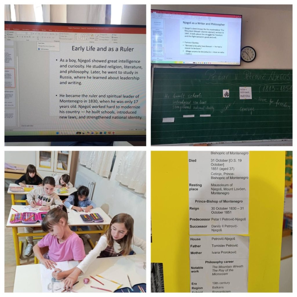 Kroz razne aktivnosti učenici su imali priliku da se upoznaju sa likom i djelom Petra II Petrovića Njegoša (prezentacije na našem i na engleskom jeziku, analiziranje teksta o Njegošu, prevođenje riječi, čitanje citata, pravljenje panoa).