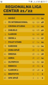 Na osam kola prije kraja Regionalne lige Centar FSCG (sezone 2021/22) jesenji šampion OFK Nikšić zauzima prvu poziciju na tabeli sa osvojenih 54 boda i impozantnom gol razlikom +60 sa velikim izgledima da tu ostane i stekne pravo da dogodine predstavlja Nikšić u Drugoj fudbalskoj ligi Crne Gore.