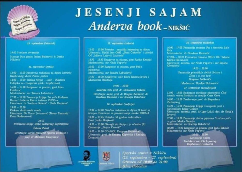 U organizaciji JU Narodne biblioteke “Njegoš” i opštine Nikšić u prostorijama Sportskog centra organizuje se jesenji sajam knjiga sa trajanjem do ponedeljka, 27. septembra. Ljubitelji knjige uživaće u širokom spektru ponuda iz domena književnosti, nauke i umjetnosti, od izdavača iz zemlje i regiona.