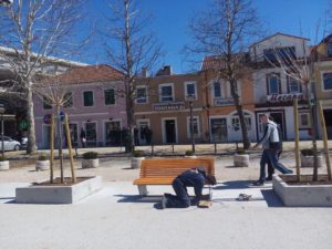 Rekonstrukcija trotoara oko trga, koja je nedavno započeta zahvaljujući donaciji Kine od 150 hiljada eura, je na polovini završenog posla, a juče je počelo i postavljanje mobilijara.