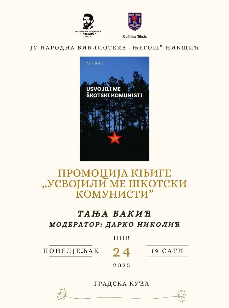JU Narodna biblioteka „Njegoš“ organizuje promociju zbirke pjesama „Usvojili me škotski komunisti“ autorice Tanje Bakić, u okviru novembarske Nikšićke kulturne scene.