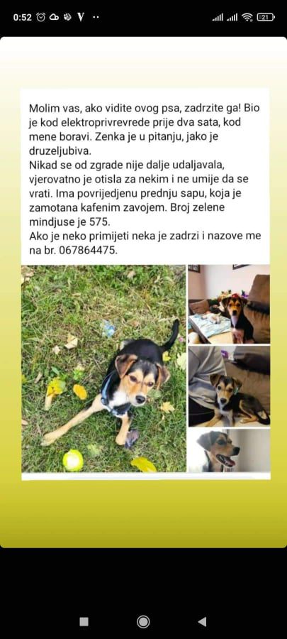 Ukoliko ga neko prepoznaje ili zna ko je vlasnik, molimo da se javi na broj telefona 068031163.