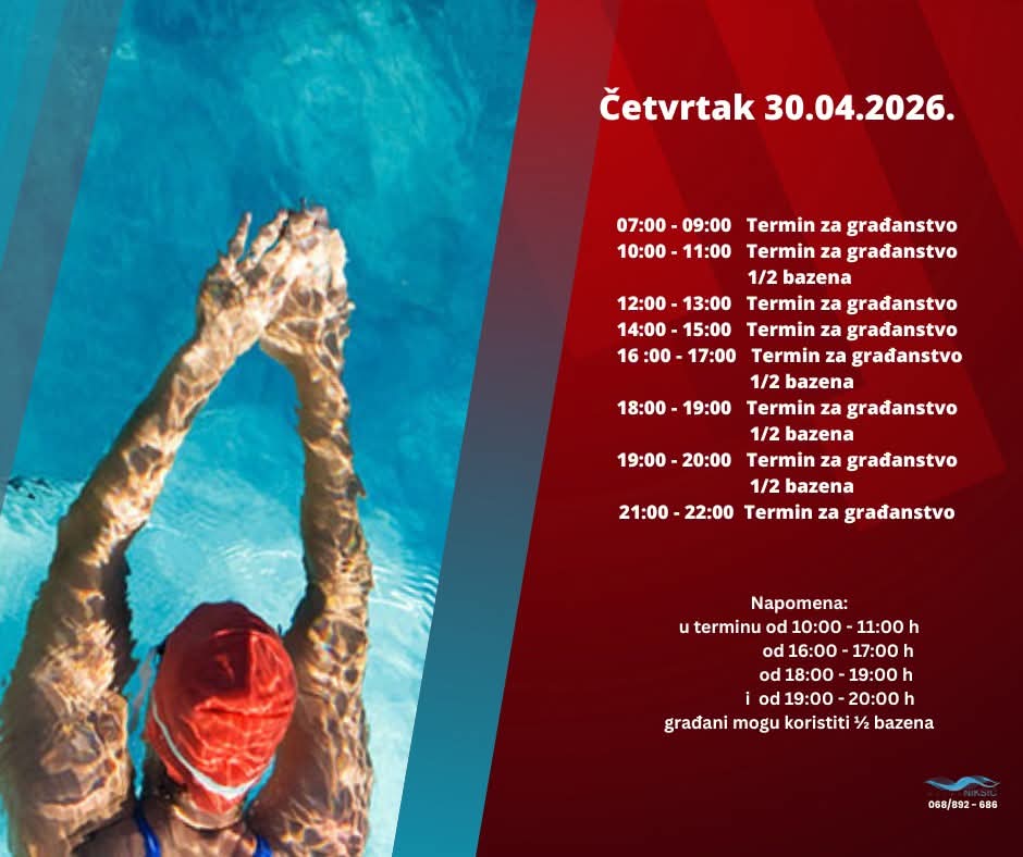 Građani Nikšića i ovog četvrtka, 30. aprila 2026. godine, mogu koristiti bazen u više dnevnih termina, uz nekoliko perioda kada će biti dostupna polovina bazena.