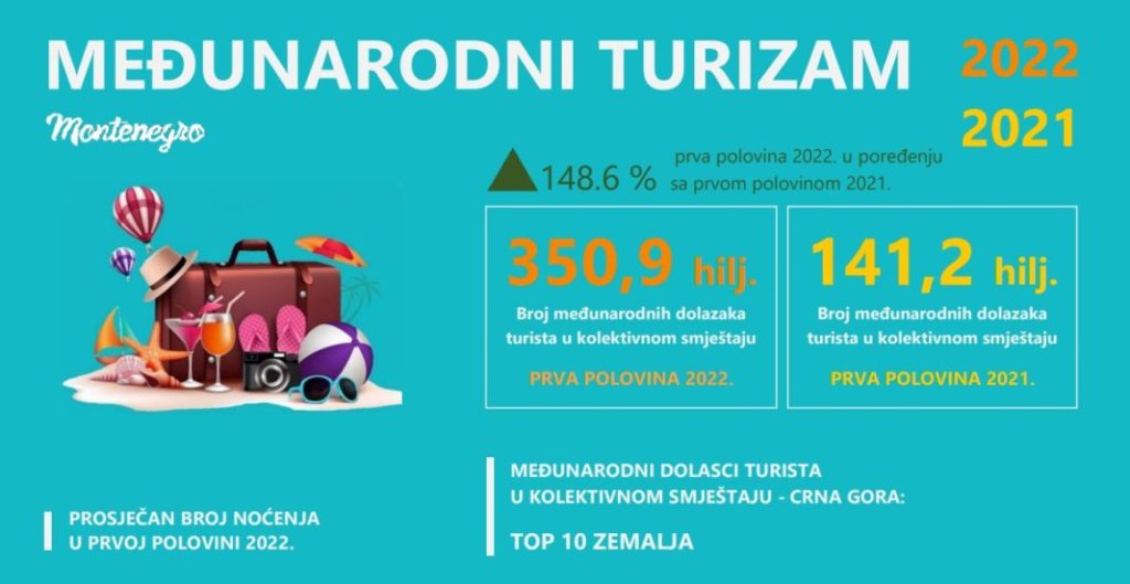 U prvoj polovini ove godine zabilježeno 350,9 hiljada međunarodnih dolazaka turista u kolektivnom smještaju u Crnoj Gori, što je 148,6 odsto više u odnosu na isti prošlogodišnji period, saopšteno je iz Monstata.