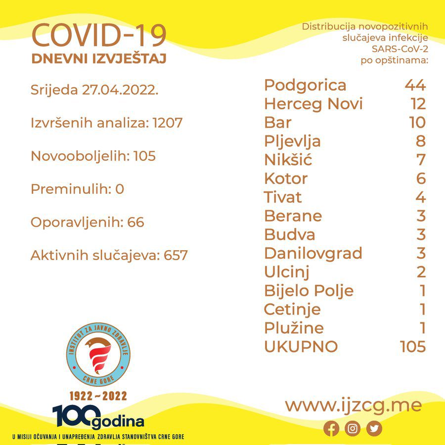 Laboratorije Instituta za javno zdravlje Crne Gore (IJZCG), druge javne i privatne laboratorije koje se bave dijagnostikom infekcije novog koronavirusa su tokom jučerašnjeg dana (srijeda, 27. 04. 2022. godine) završile analizu i IJZCG dostavile rezultate za 1.207 uzorak na novi koronavirus.