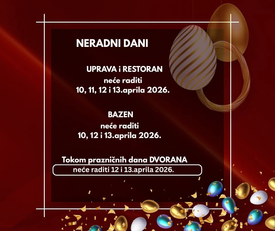 Uprava i restoran neće raditi u periodu od 10. do 13. aprila 2026. godine. Bazen neće biti u funkciji 10, 12. i 13. aprila, dok dvorana neće raditi 12. i 13. aprila 2026. godine.