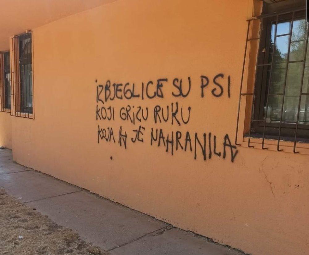 Naime na zgradi “Inđije”, odmah pored OŠ Luka Simonović, ispisan je grafit sljedeće sadržine: “Izbjeglice su psi koji grizu ruku koja ih je nahranila”.
