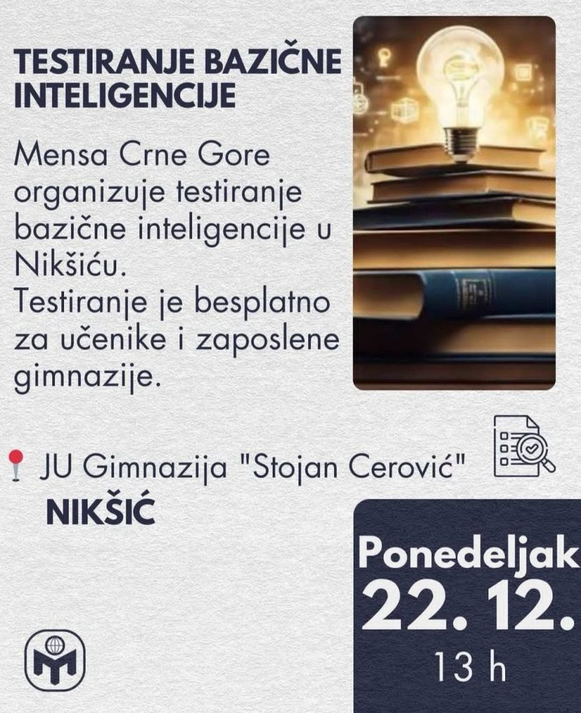 Mensa Crne Gore organizuje testiranje bazične inteligencije u Nikšiću, koje će biti održano u ponedjeljak, 22. decembra 2025. godine, sa početkom u 13h, u prostorijama JU Gimnazije “Stojan Cerović”.