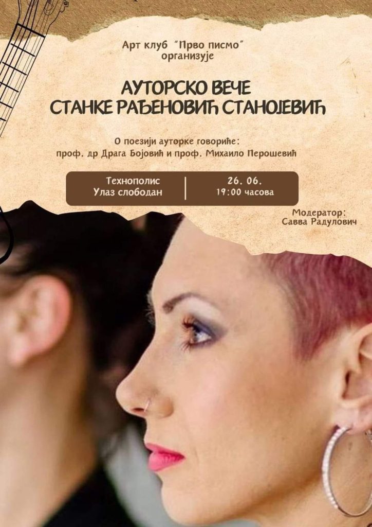 U IPC Tehnopolis, u srijedu, 26. juna, sa početkom u 19 časova, biće upriličeno autorsko veče Stanke Rađenović Stanojević.
