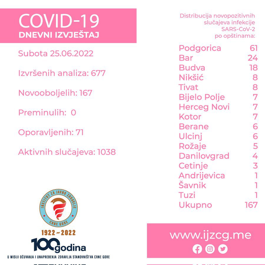 Novootkriveni slučajevi su iz Podgorice 24, Nikšića pet, Kotora četiri, iz Budve i sa Cetinja po tri, a iz Herceg Novog dva. U Andrijevici, Baru, Danilovgradu, Mojkovcu, Rožajama i Ulcinju registrovan je po jedan novi slučaj koronavirusa.