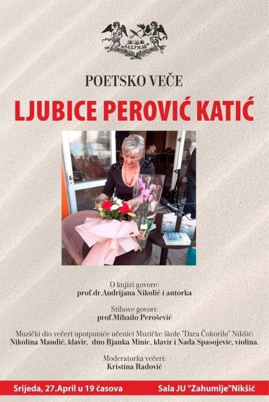 Poetsko veče Ljubice Perović Katić, pjesnikinje iz Splita, u okviru kojeg će biti promovisane dvije knjige poezije „Od bola do ljubavi“ i „Tebi, a sebi“ biće održano u srijedu, 27. aprila u organizaciji JU „Zahumlja“ sa početkom u 19h.