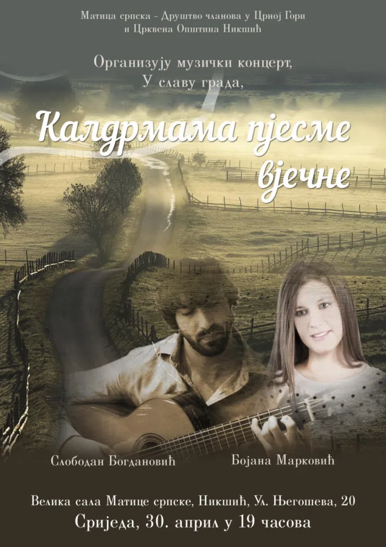 Koncert pod nazivom „Kaldrmama pjesme vječne“ biće održan u prostorijama Matice srpske – Društva članova u Crnoj Gori u Nikšiću, sa početkom u 19 časova.
