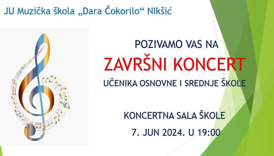U Koncertnoj sali Muzičke škole, večeras sa početkom u 19 časova, biće upriličen završni koncert učenika osnvne i srednje Muzičke škole “Dara Čokorilo”.