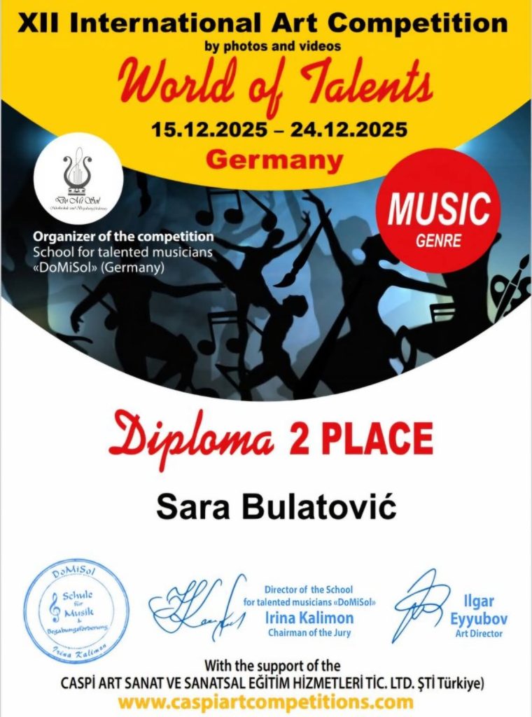 Učenice Odsjeka za solo pjevanje ponovo su ostvarile zapažene rezultate na međunarodnim onlajn takmičenjima – XII International Art Competition „Art Planet“, održanom u Turskoj od 17. do 25. decembra, i XII International Competition „World of Talents“, održanom u Njemačkoj od 16. do 24. decembra.
